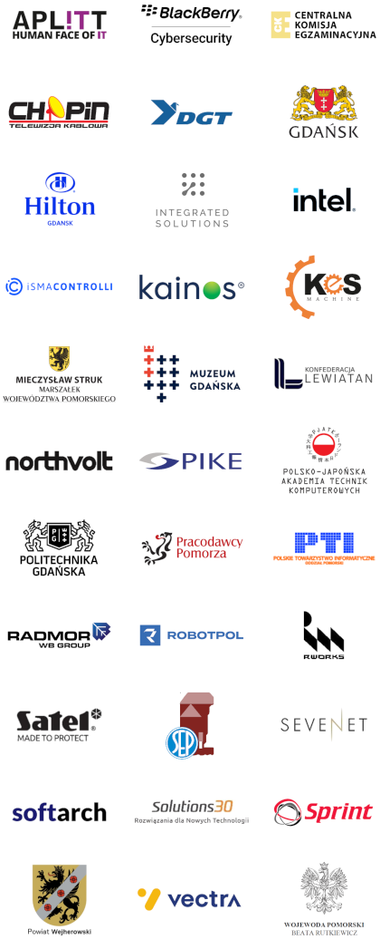 APLIT | BLACKBERRY | CENTRALNA KOMISJA EGZAMINACYJNA | CHOPIN TELEWIZJA KABLOWA | DGT | MIASTO GDAŃSK | HILTON | INTEGRATED SOLUTIONS | INTEL | ISMACONTROLLI | KAINOS | KES MACHINE | MARSZAŁEK WOJEWÓDZTWA POMORSKIEGO MIECZYSŁAW STRUK | MUZEUM GDAŃSKA | LEWIATAN | NORTHVOLT | POLSKA IZBA KOMUNIKACJE ELEKTRONICZNEJ | POLSKO-JAPOŃSKA AKADEMIA TECHNIK KOMPUTEROWYCH | POLITECHNIKA GDAŃSKA | PRACODAWCY POMORZA | POLSKIE TOWARZYSTWO INFORMATYCZNE ODDZIAŁ POMORSKI | RADMOR | ROBOTPOL | RWORKS | SATEL | STOWARZYSZENIE ELEKTRYKÓW POLSKICH ODDZIAŁ GDAŃSKI | SEVENET | SOFTARCH | SOLUTIONS30 | SPRINT | STAROSTA POWIATU WEJHEROWSKIEGO | VECTRA | WOJEWODA POMORSKI BEATA RUTKIEWICZ